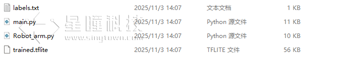 main.py、trained.tflite、labels.txt和Robot_arm.py放入 OpenMV 的 SD 卡目录中。- 按下