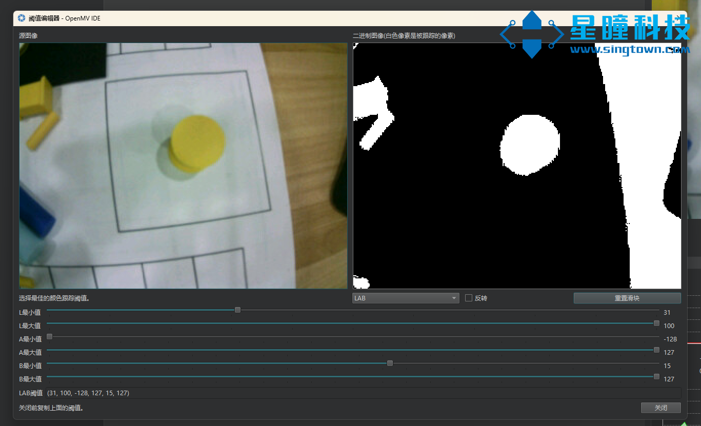 当色块出现不识别、乱检测或识别不准时,请使用 OpenMV IDE 中的阈值编辑器重新调整阈值: