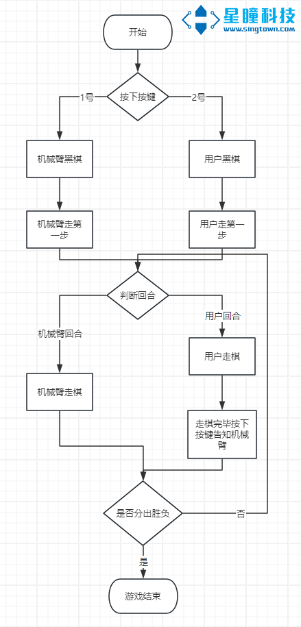 - 用户方每完成一步,需要按下按键告知机械臂完成走棋