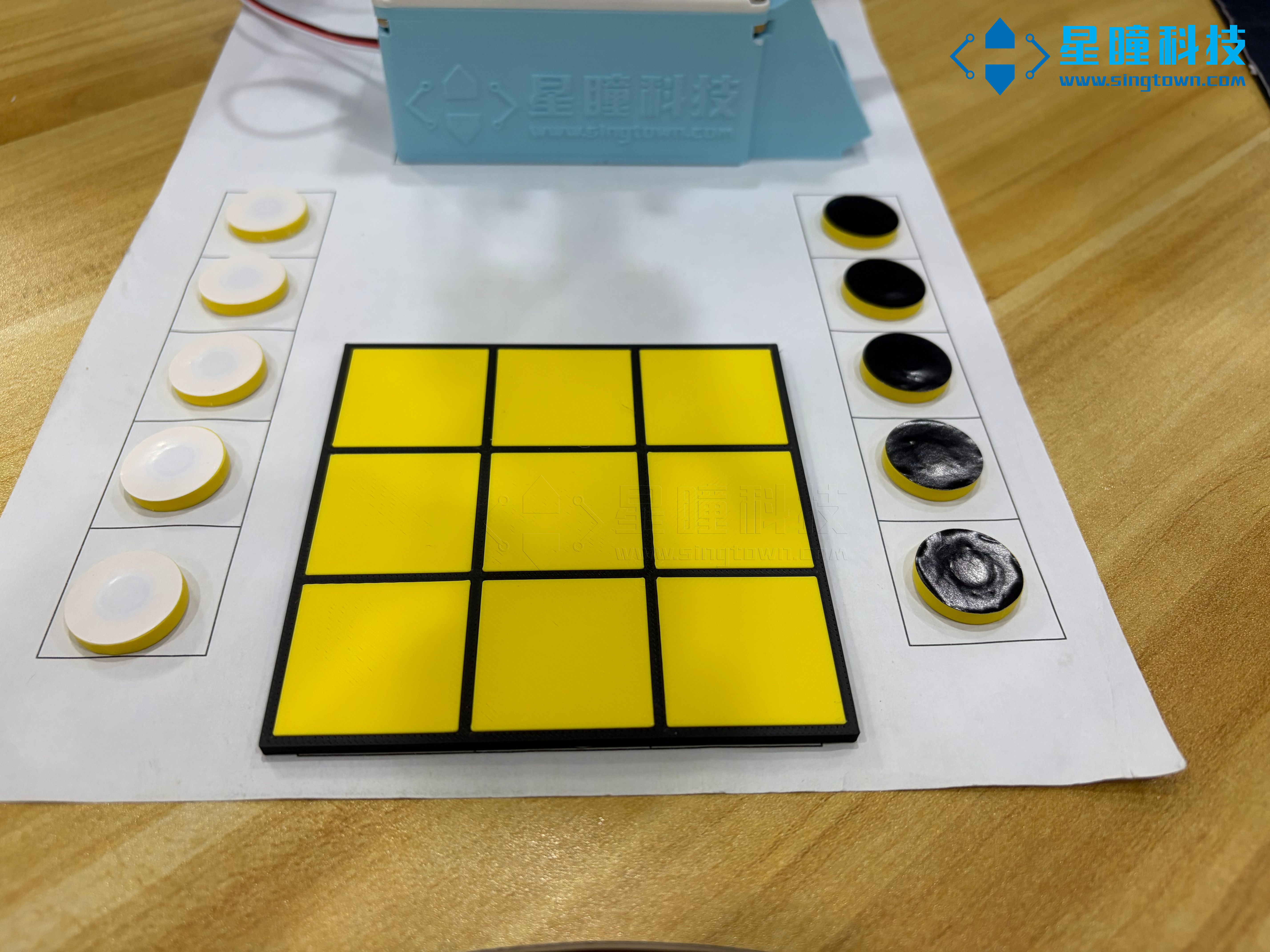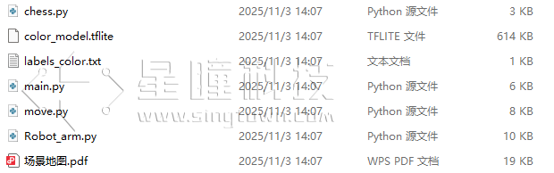 chess.py:三子棋解算代码(用于判断走棋与胜负)color_model.tflite与labels_color.txt:棋子识别的分类模型与标签move.py:机械臂抓取与放置动作代码main.py:本历程的主程序,负责流程调度与按键交互Robot_Arm.py:机械臂控制模块- 场景地图(PDF):请将地图打印为 A4 纸并放置于桌面作为棋盘参考