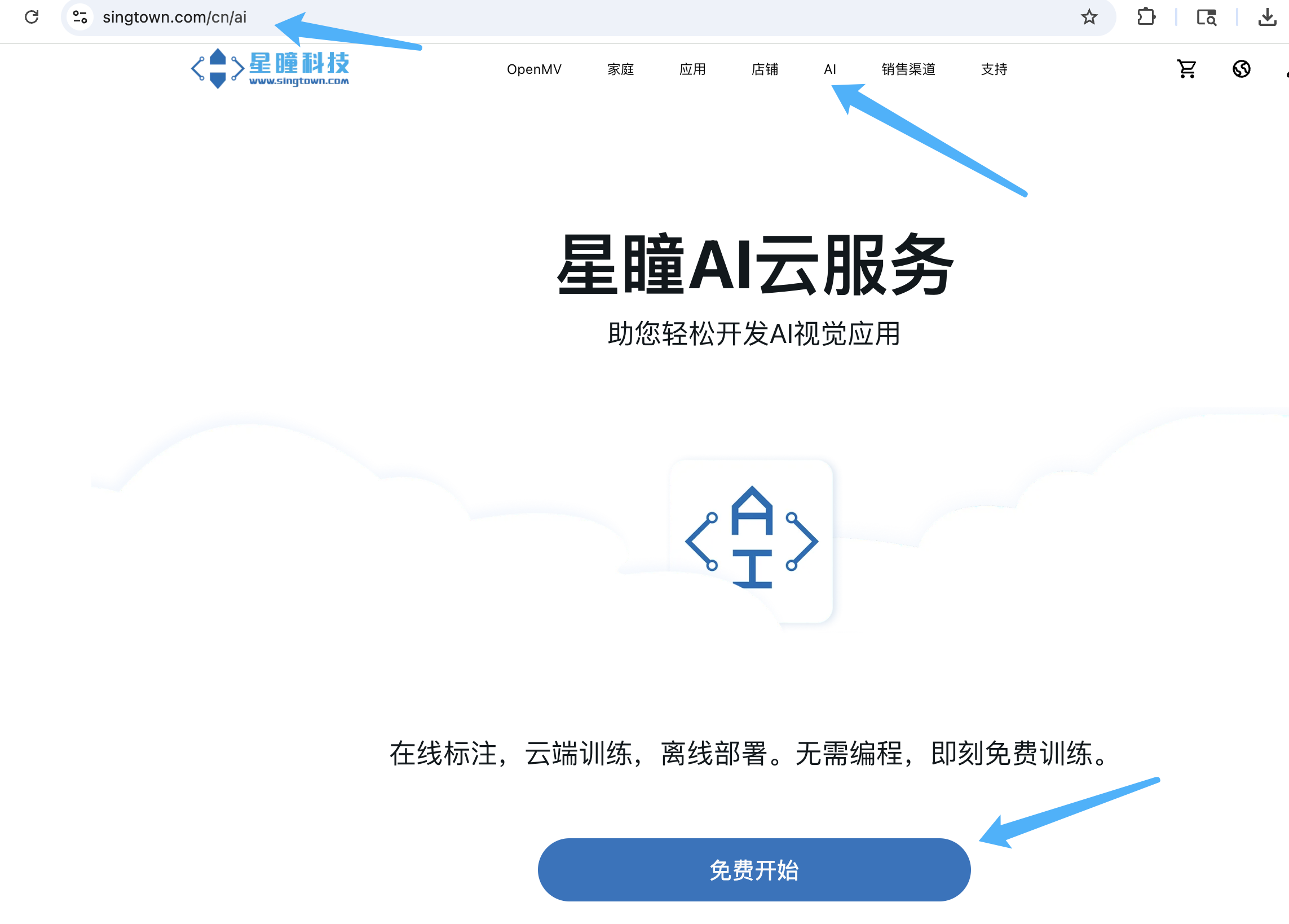 星瞳AI云服务进入路径:星瞳科技OpenMV官网 OpenMV.cc - 上方菜单栏 点击 AI ,即可开始。